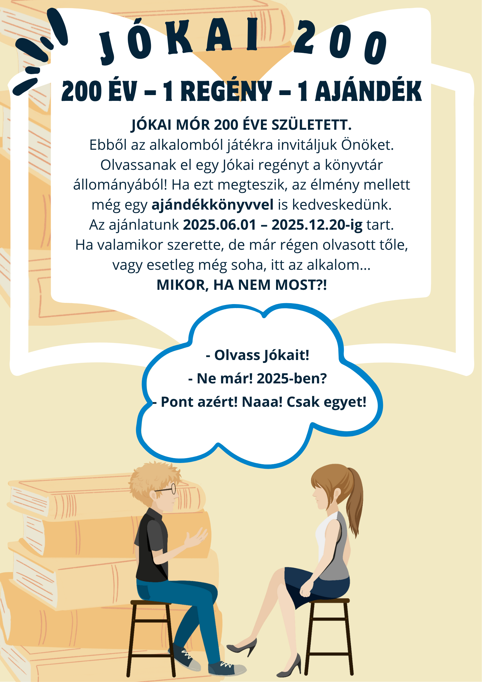 Ebből az alkalomból játékra invitáljuk Önöket. Olvassanak el egy Jókai regényt a könyvtár állományából,s válaszoljanak néhány egyszerű kvízkérdésre! Ha ezt megteszik, az élmény mellett még egy ajándékkönyvvel is kedveskedünk.