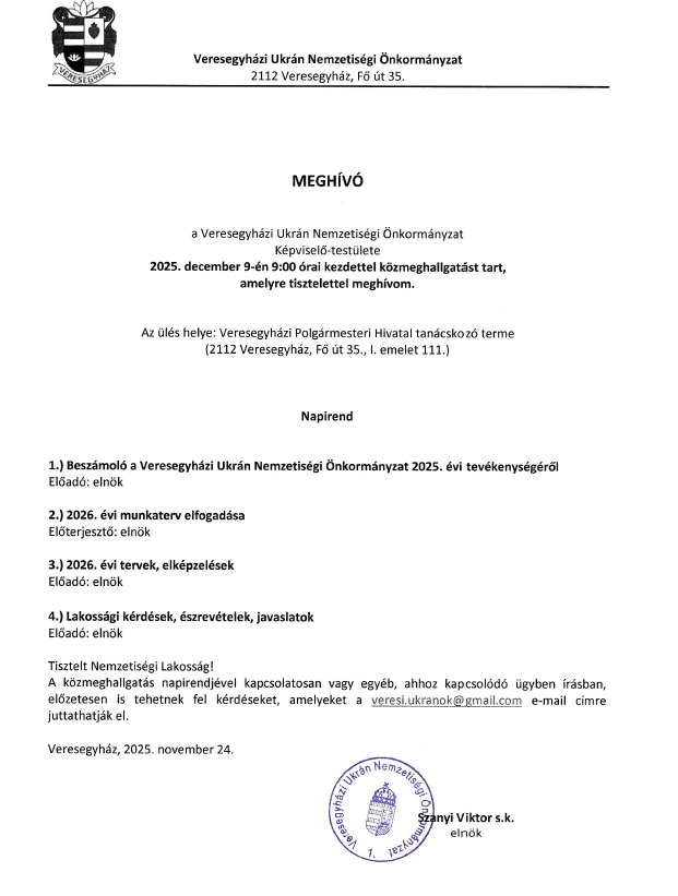 Veresegyházi Ukrán Nemzetiségi Önkormányzat Képviselő-testülete 2025. december 9-én, kedden 9:00 órai kezdettel közmeghallgatást tart.